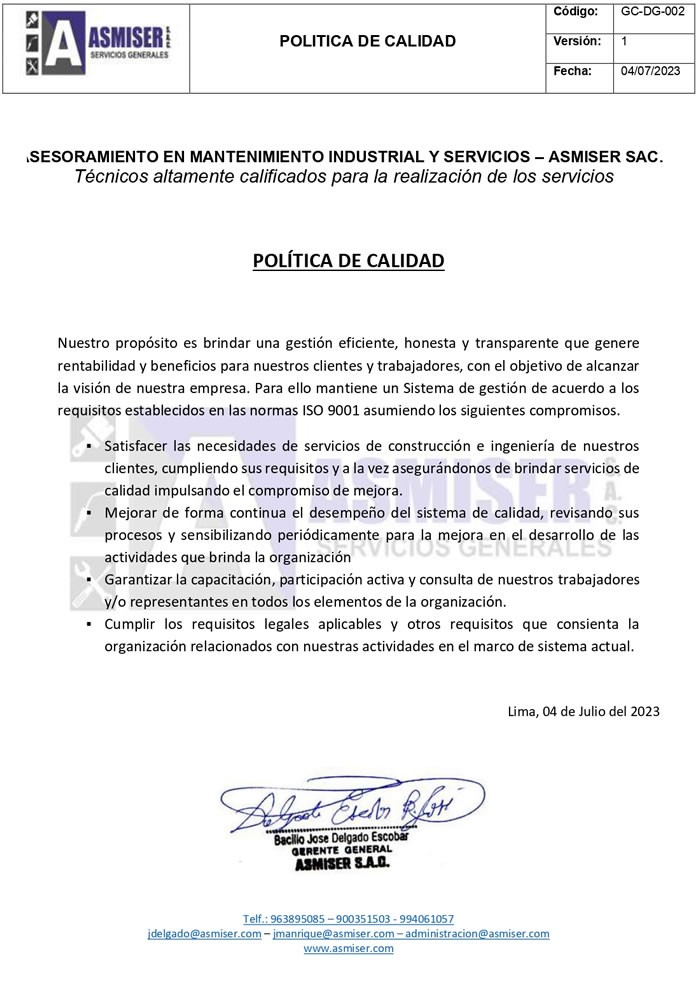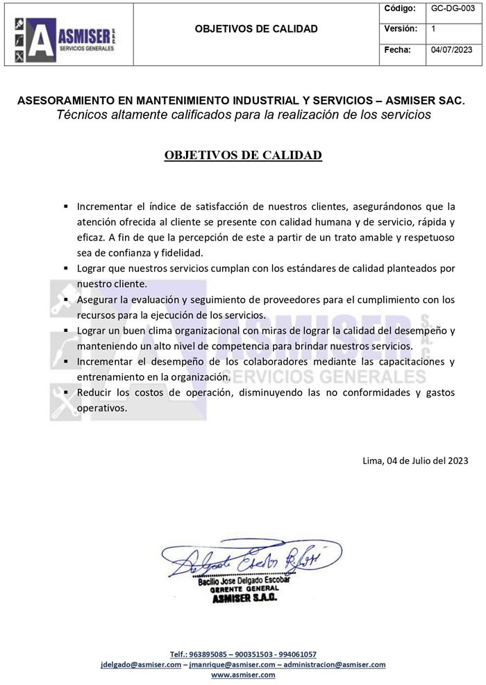 ASMISER SAC, es una empresa emergente que pone a su disposición una amplia variedad de servicios generales y profesionales. Para ello, contamos con personal técnico especializado y altamente capacitado que destaca por sus cualidades tanto personales como profesionales para afrontar los retos presentes y futuros.